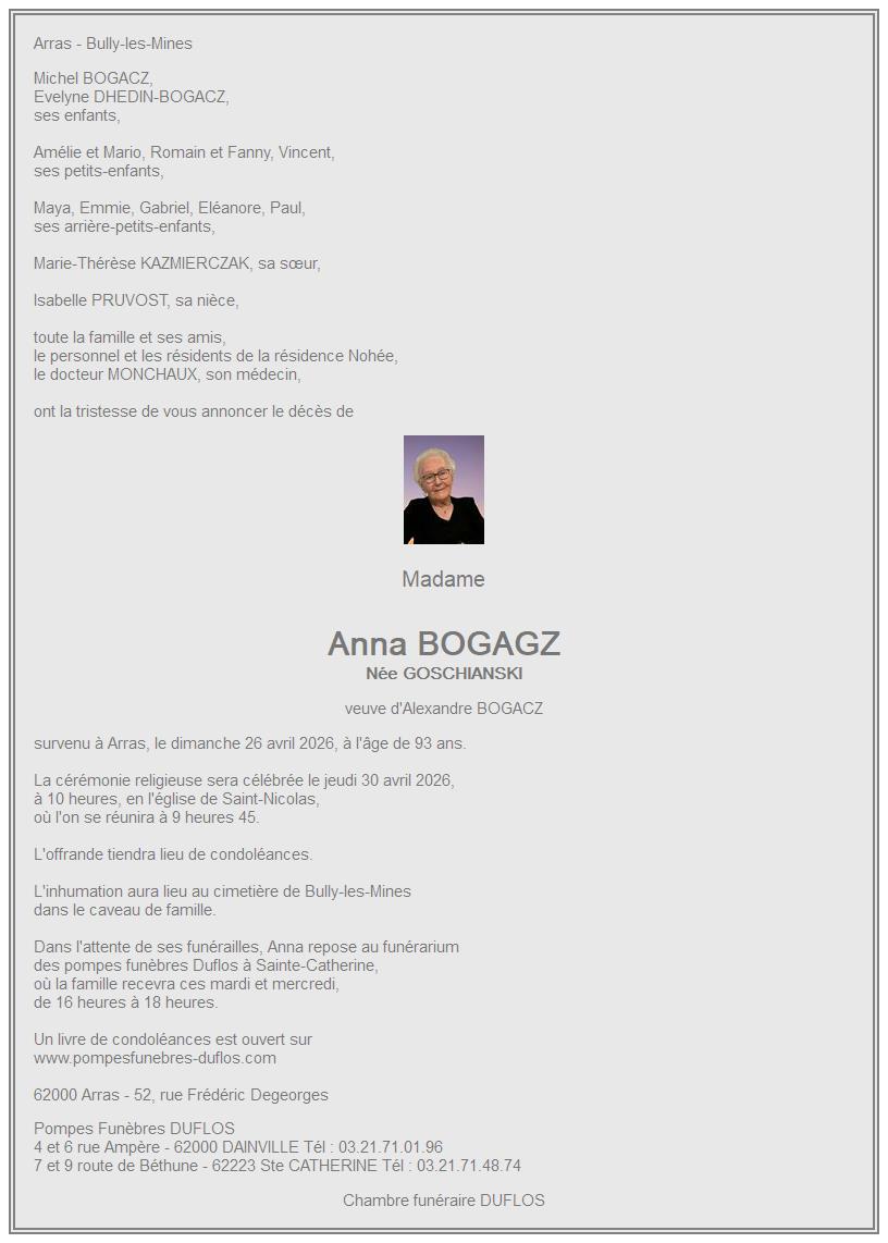 Avis de décès de Madame Anna BOGAGZ née GOSCHIANSKI