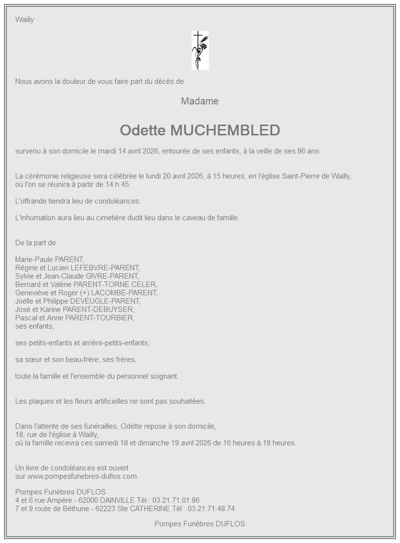 Avis de décès de Madame Odette PARENT née MUCHEMBLED