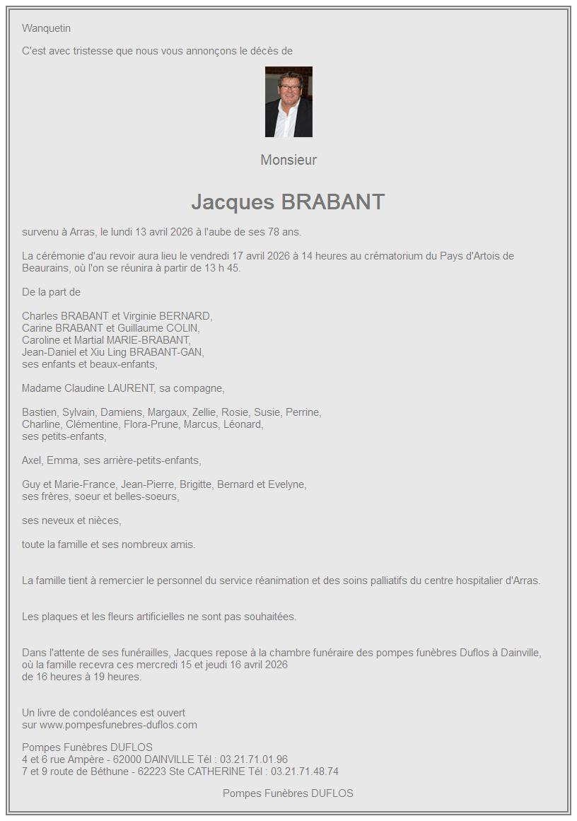 Décédé à Arras (62000, France) le lundi 13 avril 2026 à l'âge de 77 ans
