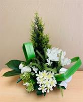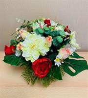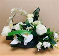 | Bouquet de fleurs artificielles Bouquet lesté pour éviter la prise au vent dans les tons blanc (rose et orchidées) composition pouvant être mise dans un vase.